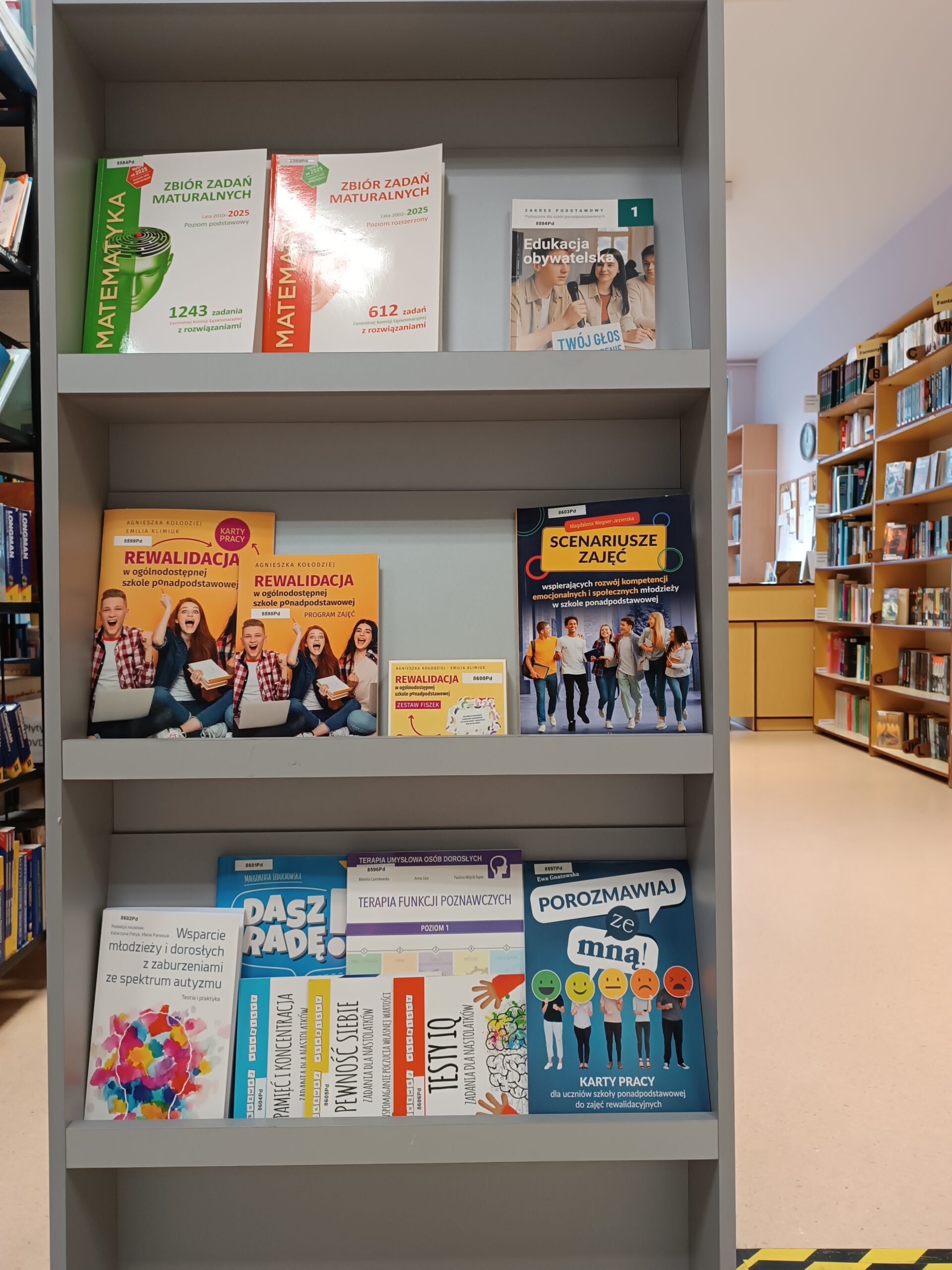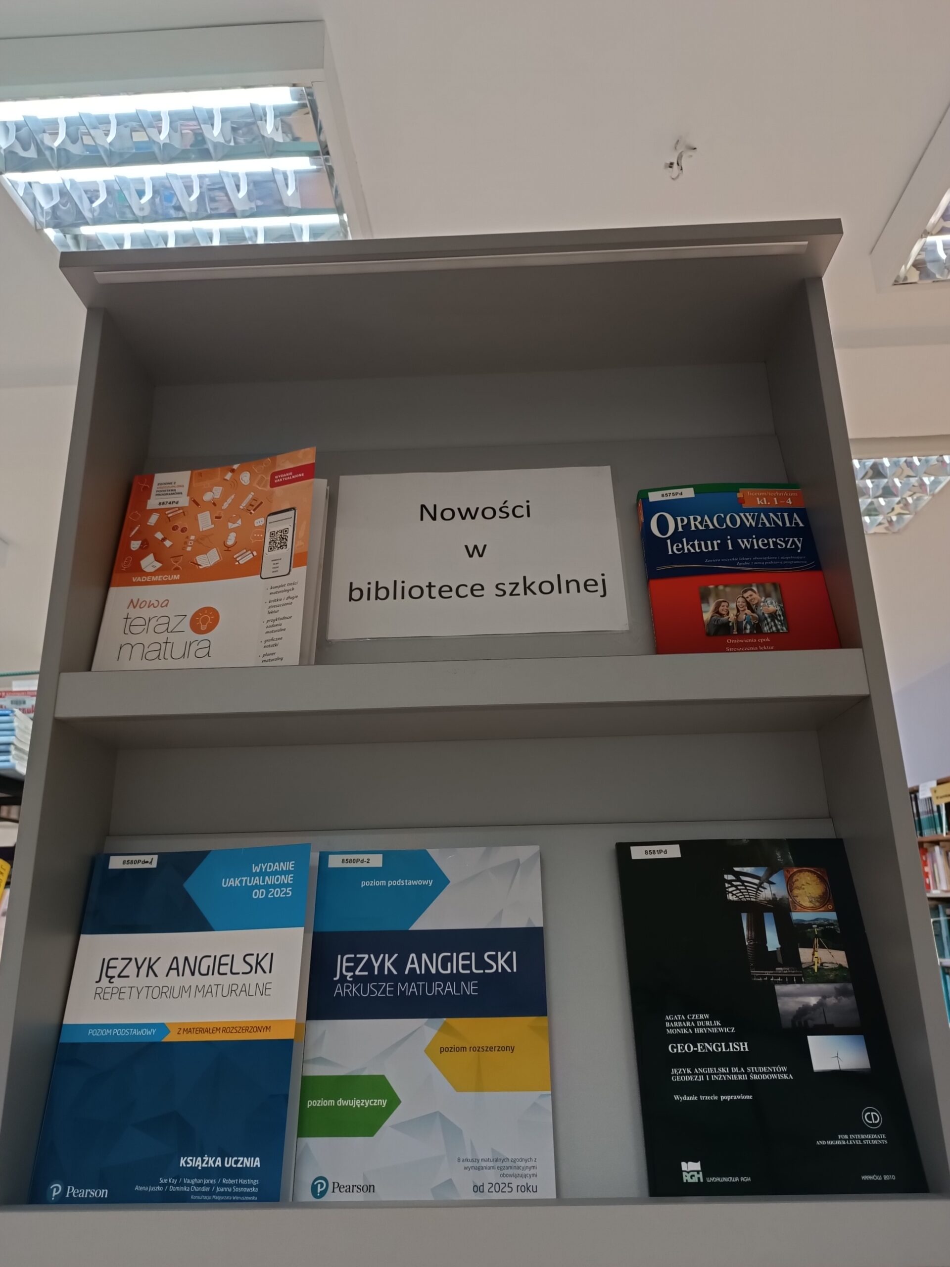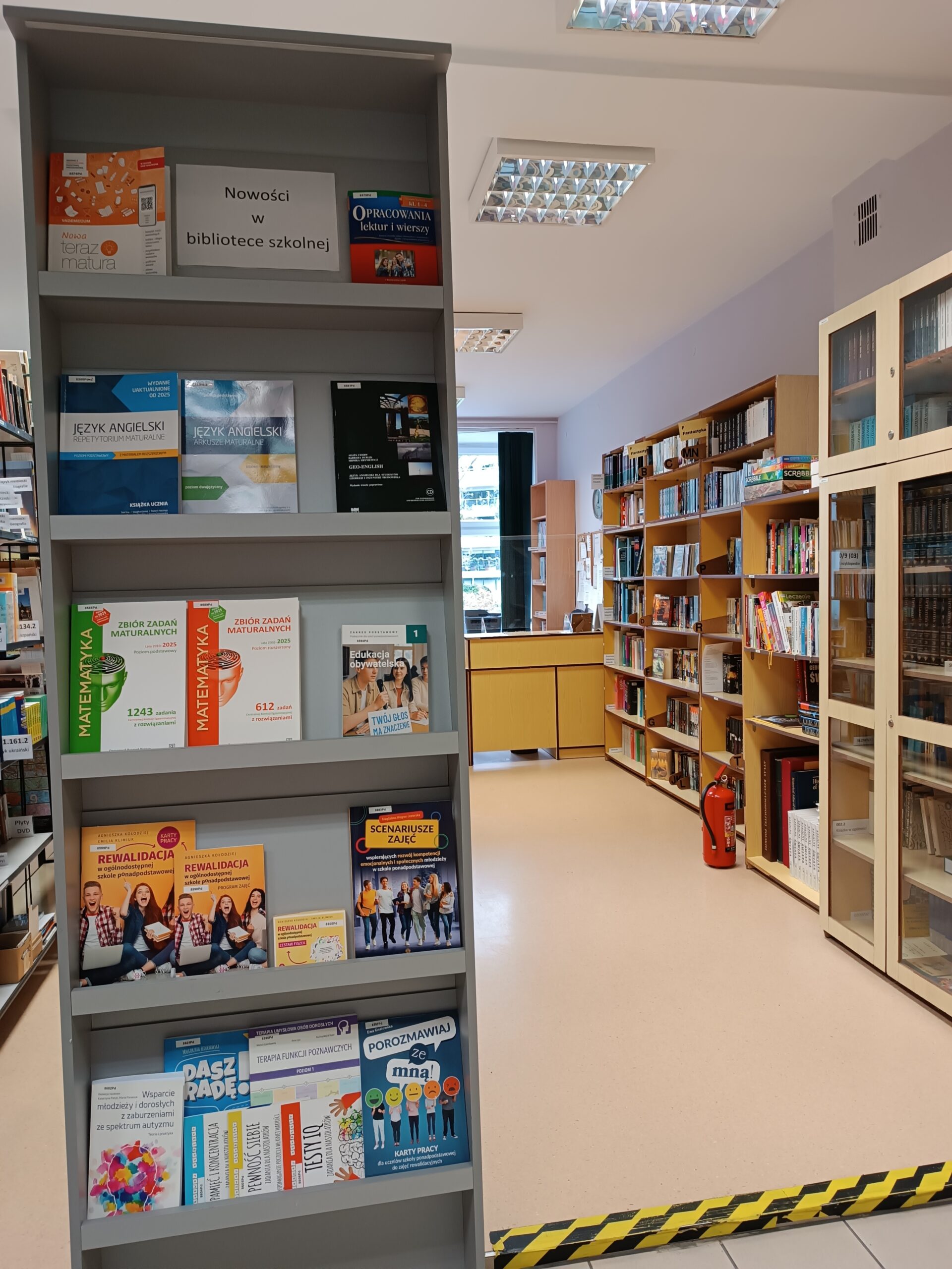 W październiku 2025r. zostały zakupione do biblioteki:program dla nauczycieli wychowania fizycznego, vademecum z języka polskiego dla maturzystów, opracowania lektur z języka polskiego (od antyku do współczesności), zbiory zadań maturalnych z matematyki (poziom podstawowy i rozszerzony), repetytorium z języka angielskiego,  języka angielskiego zawodowego oraz różne pomoce dla pedagogów specjalnych.
