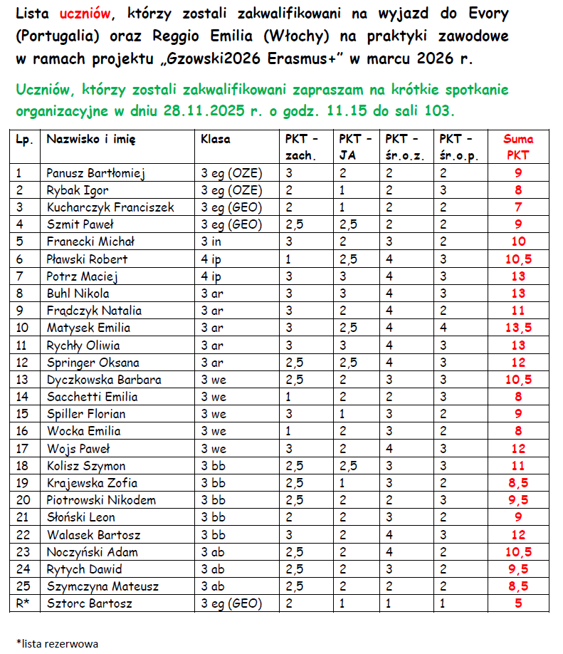 W bieżącym roku szkolnym 2025/26 zostanie zorganizowany wyjazd dla dwóch grup w ramach projektu „Gzowski2026 Erasmus+” na praktyki zawodowe. Będą one trwały 20 dni roboczych – 4 tygodnie, w terminie 2-27 III 2026 r.
