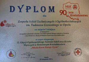 W dniu 25 listopada 2025r. w Centrum Dialogu Obywatelskiego w Opolu odbyło się podsumowanie etapu okręgowego XXII edycji Ogólnopolskiego Turnieju Szkół Ponadpodstawowych, Policealnych i Pomaturalnych oraz Uczelni Wyższych w Honorowym Krwiodawstwie ph.: ,,Moda Krew Ratuje Życie”.