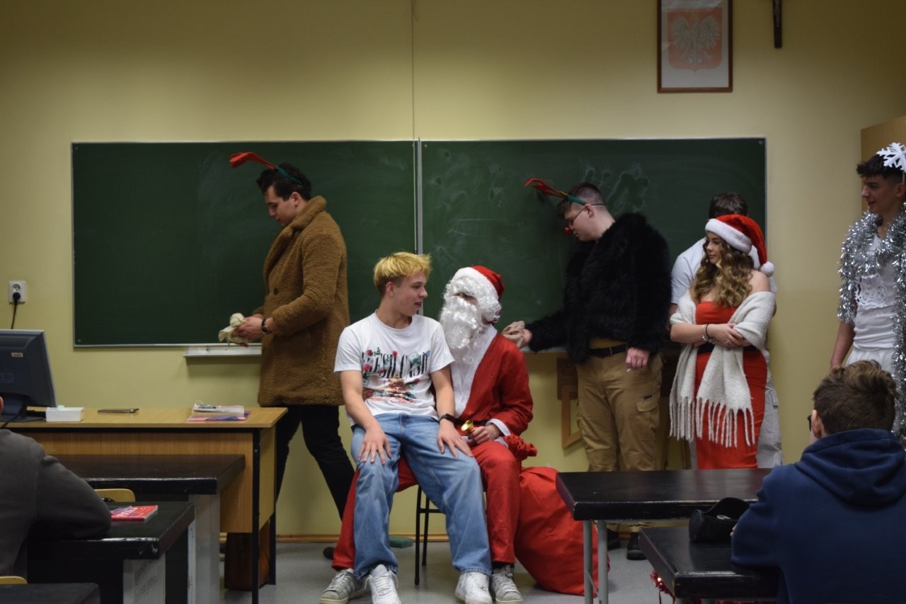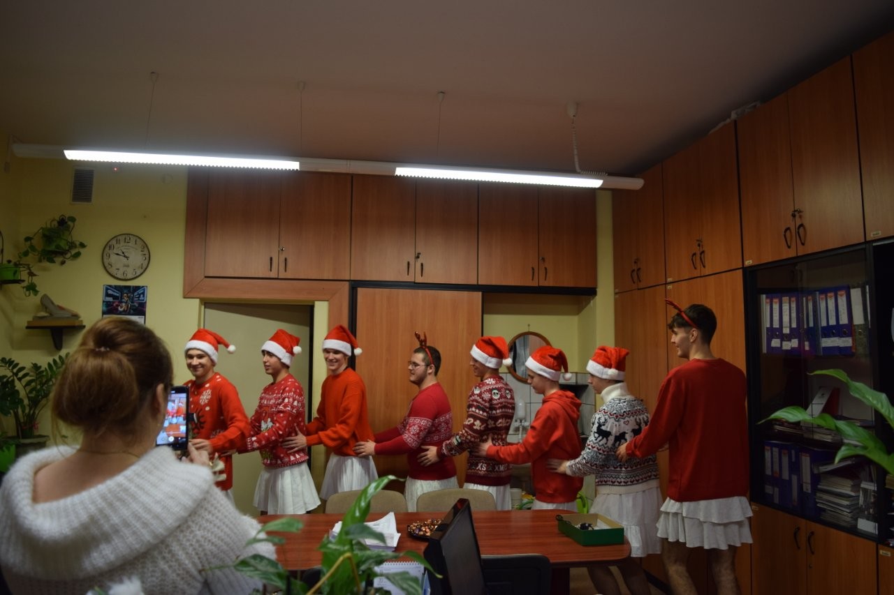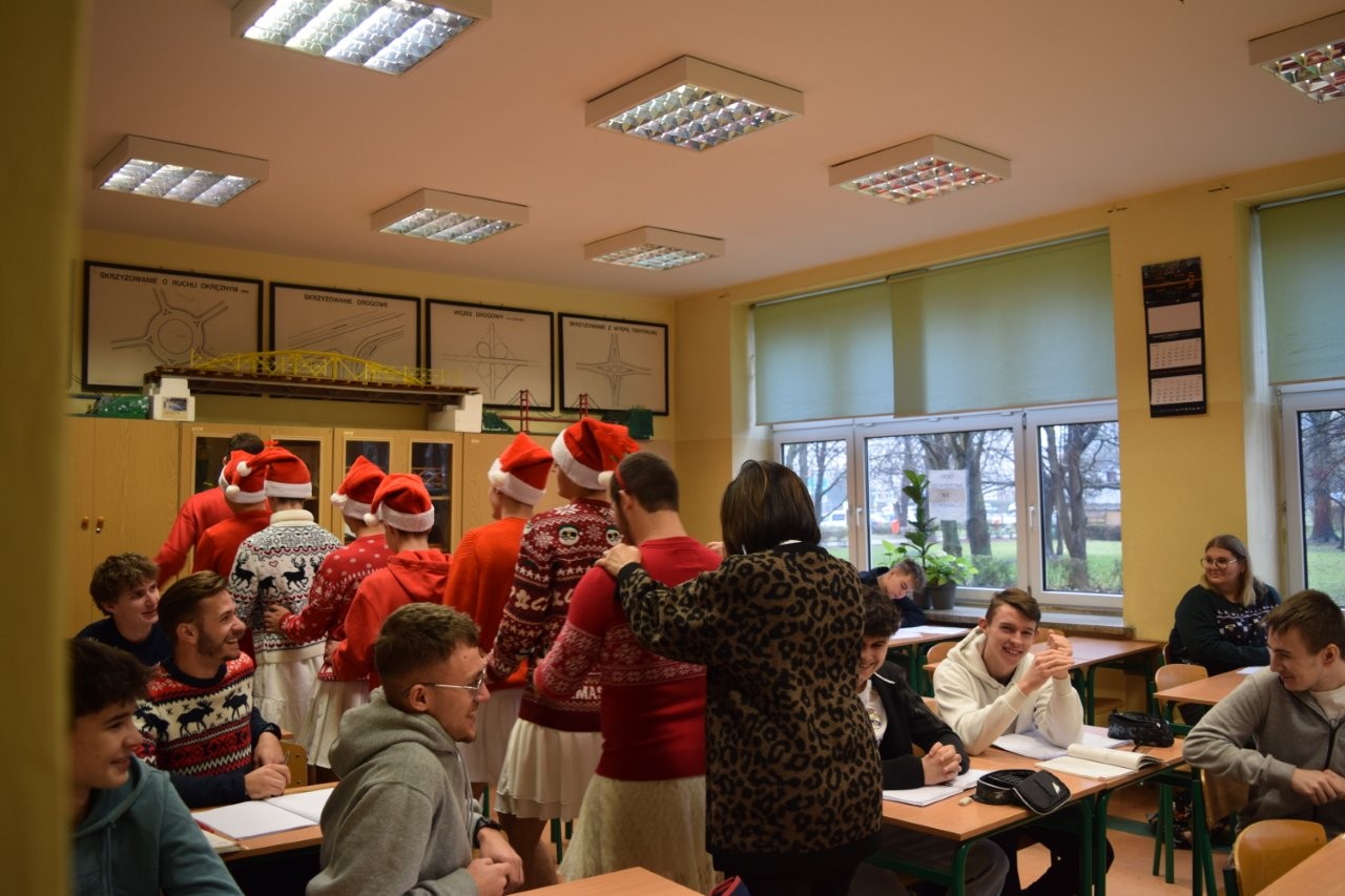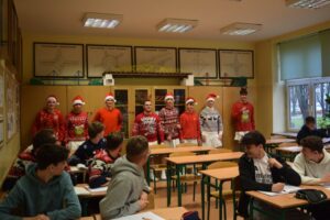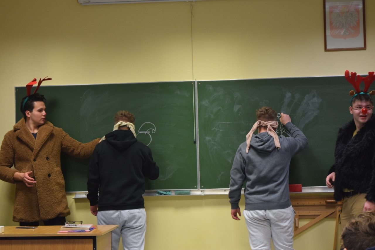 oraz ekipa tańczących mikołajków. Chodzili po klasach rozdawali cukierki, były także zawody z rysowania mikołaja na czas oraz jaka to melodia w wersji kolędy. Byli nawet tacy którzy stwierdzili, że wchodzenie do szkoły jest nudne więc wjechali do niej na swym crossie. Niektórym z naszych nauczycieli a nawet panu dyrektorowi, paniom w sekretariacie oraz innym nauczycielom mikołaj wręczył „rózgidziękujemy” za przygotowania pani Debudaj, 4b/b oraz 3 a/r bardzo dziękujemy.