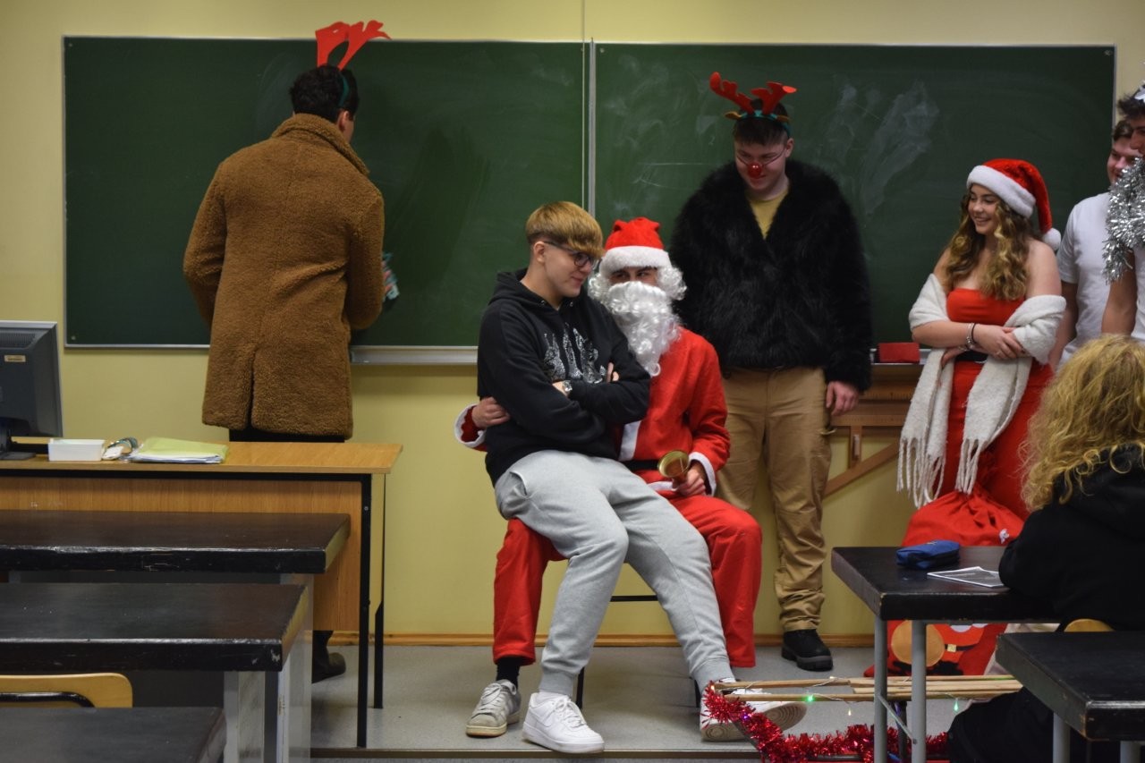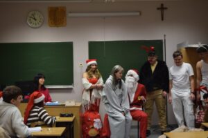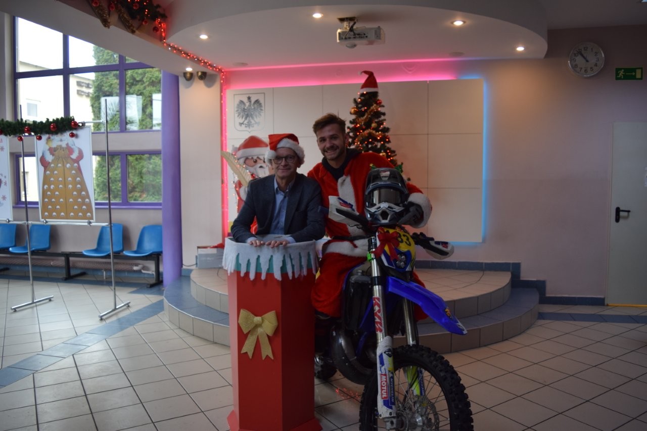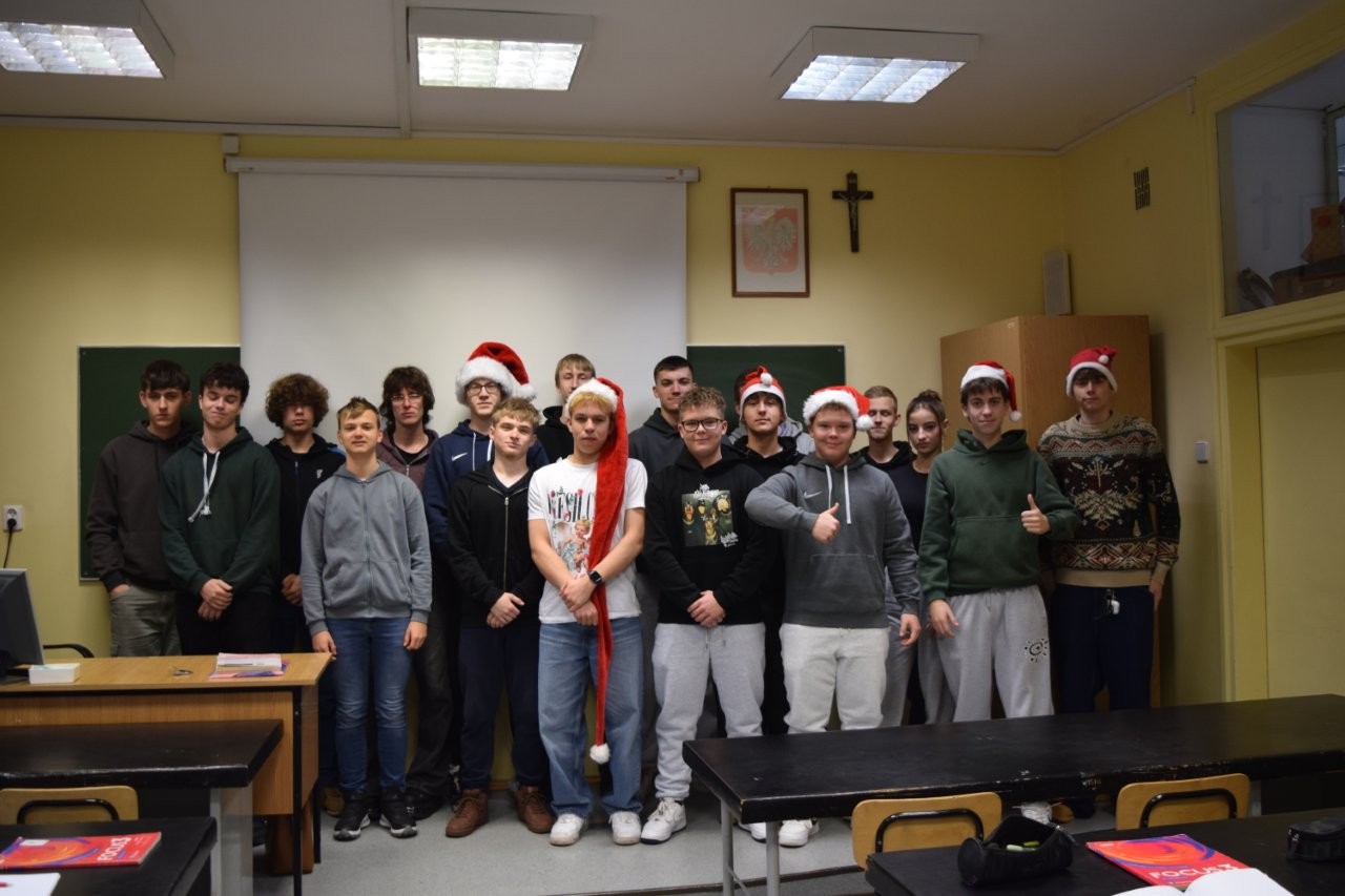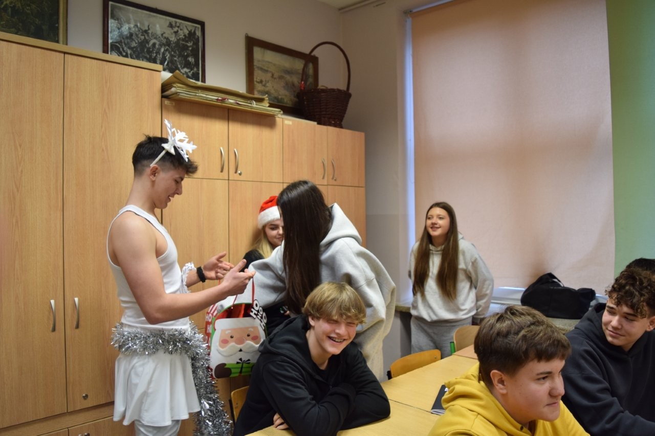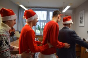 oraz ekipa tańczących mikołajków. Chodzili po klasach rozdawali cukierki, były także zawody z rysowania mikołaja na czas oraz jaka to melodia w wersji kolędy. Byli nawet tacy którzy stwierdzili, że wchodzenie do szkoły jest nudne więc wjechali do niej na swym crossie. Niektórym z naszych nauczycieli a nawet panu dyrektorowi, paniom w sekretariacie oraz innym nauczycielom mikołaj wręczył „rózgidziękujemy” za przygotowania pani Debudaj, 4b/b oraz 3 a/r bardzo dziękujemy.
