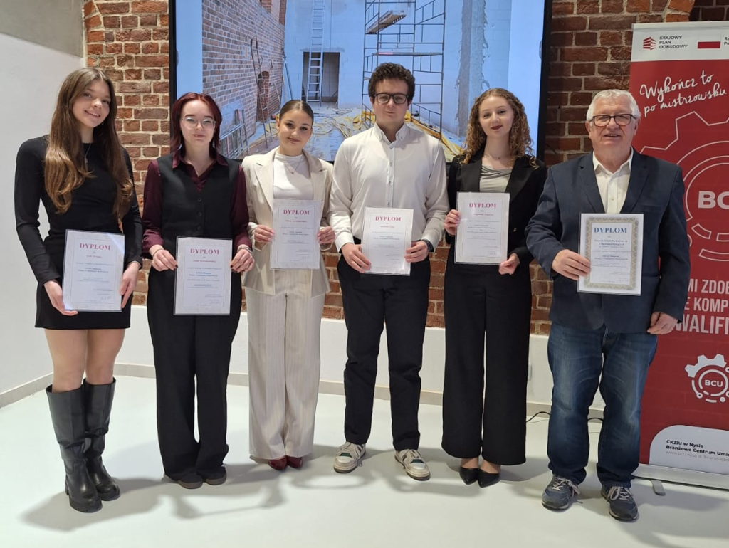 Nasi uczniowie którzy zdobyli pierwsze miejsce drużynowo na okręgowej olimpiadzie wiedzy i umiejętności budowlanych w Nysie.